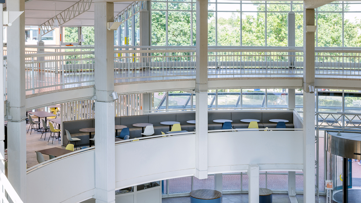 Die rund 100 Sitzplätze für die Besucherinnen und Besucher befinden sich auf der Galerie in der vorgelagerten Eingangshalle – der sogenannten Rotunde. Der neu gestaltete Gastronomiebereich schafft mit einem modernen Möblierungskonzept und farbigen Akzenten eine angenehme Atmosphäre zum Entspannen und Verweilen. Eine moderne Essensausgabe bildet die Schnittstelle zwischen dem öffentlichen Bereich und der Großküche. Im Zuge der Maßnahme wurde die bestehende Galerie baulich erweitert, eine Brücken-Anbindung geschaffen und die vorhandene Aufzugsanlage ertüchtigt.