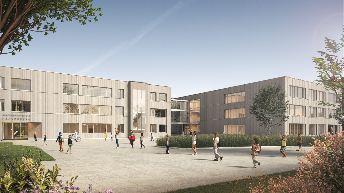 Die bestehende Ganztagshauptschule Hackenberg ist derzeit auf zwei Standorte aufgeteilt und soll am Standort Hackenberg als Teil eines Schulzentrums zusammengezogen werden. Um den zusätzlichen Raumbedarf für einen dreizügigen Schulbetrieb zu schaffen und um den Anforderungen an einen zeitgemäßen Schulbau gerecht zu werden, wird der Bestand umfassend saniert und um einen Neubau mit clusterartigen Raumstrukturen ergänzt.